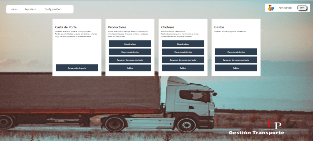 Esta aplicación esta diseñada para administrar en forma simple y rápida tu empresa de transporte desde tu PC, celular o cualquier dispositivo móvil en cualquier momento desde cualquier lugar. Pudiendo gestionar las cartas de porte, gastos, cuenta de choferes y productores todo desde una sola aplicación con acceso a consulta de saldos, emisión de resúmenes y reportes en PDF o Excel que puedes enviar por whatsapp, correo o el medio que elijas.